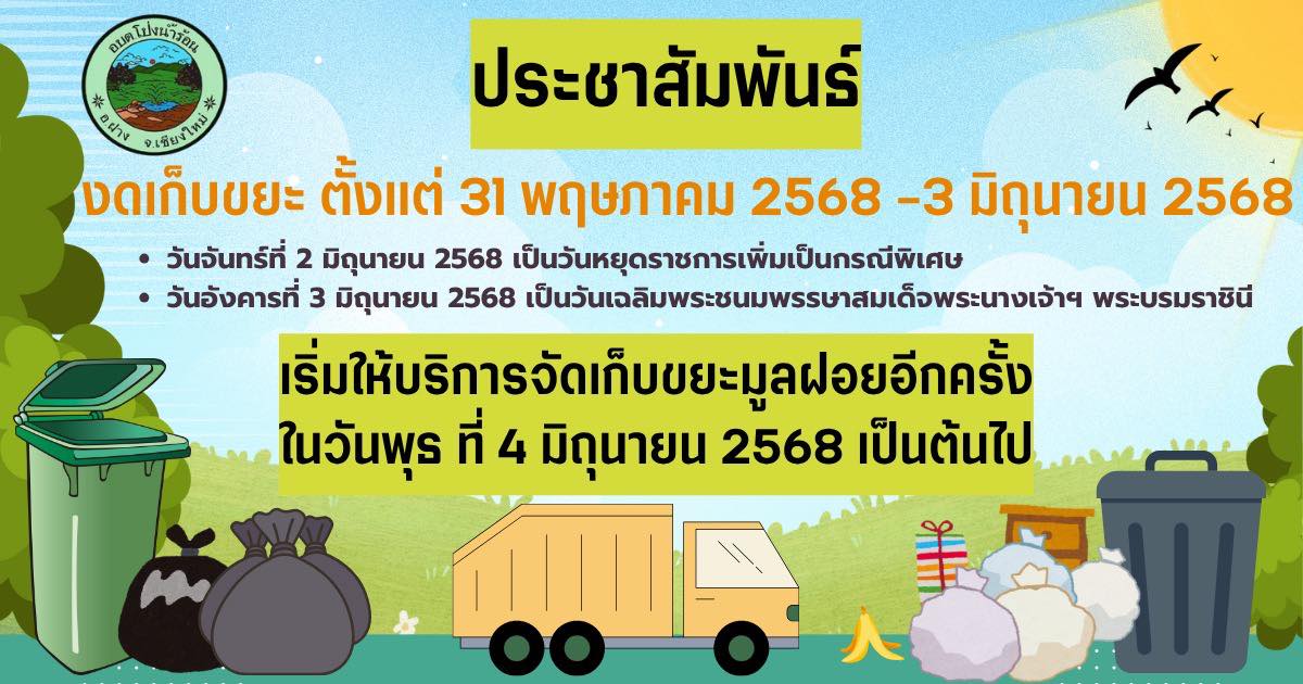 ชื่อเรื่อง : ประชาสัมพันธ์ งดเก็บขยะ ตั้งแต่ 31 พฤษภาคม 2568 - 3 มิถุนายน 2568