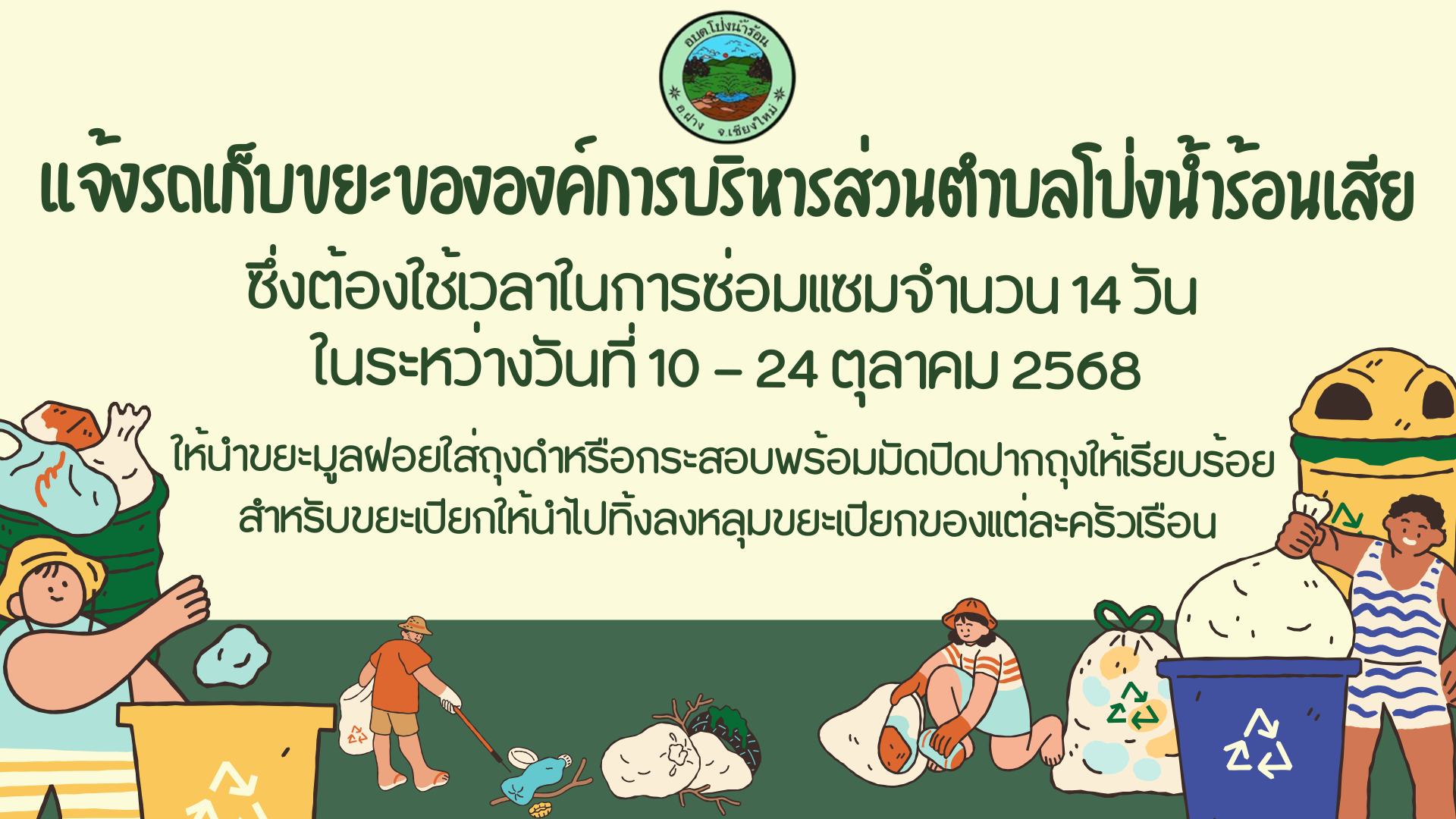 ชื่อเรื่อง : แจ้งรถจัดเก็บขยะมูลฝอย องค์การบริหารส่วนตำบลโป่งน้ำร้อน ชำรุด ให้ประชาชนทำการจัดเก็บขยะลงถุงดำหรือถุงกระสอบ แล้วนำไปวางไว้ตามจุดที่ให้บริการทิ้งขยะ หากมีข้อสงสัยสอบถามรายละเอียดเพิ่มเติมได้ที่ 053-451234 หรือ 080-6163506