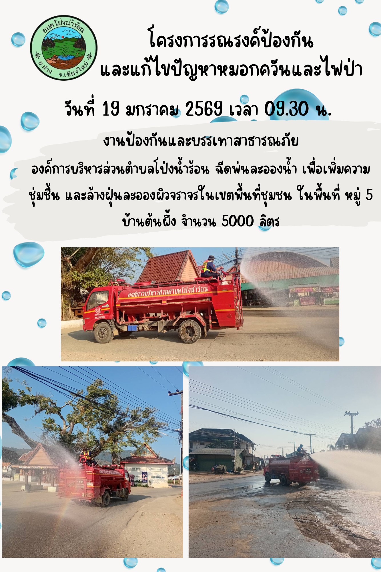 องค์การบริหารส่วนตำบลโป่งน้ำร้อน ฉีดพ่นละอองน้ำ เพื่อเพิ่มความ