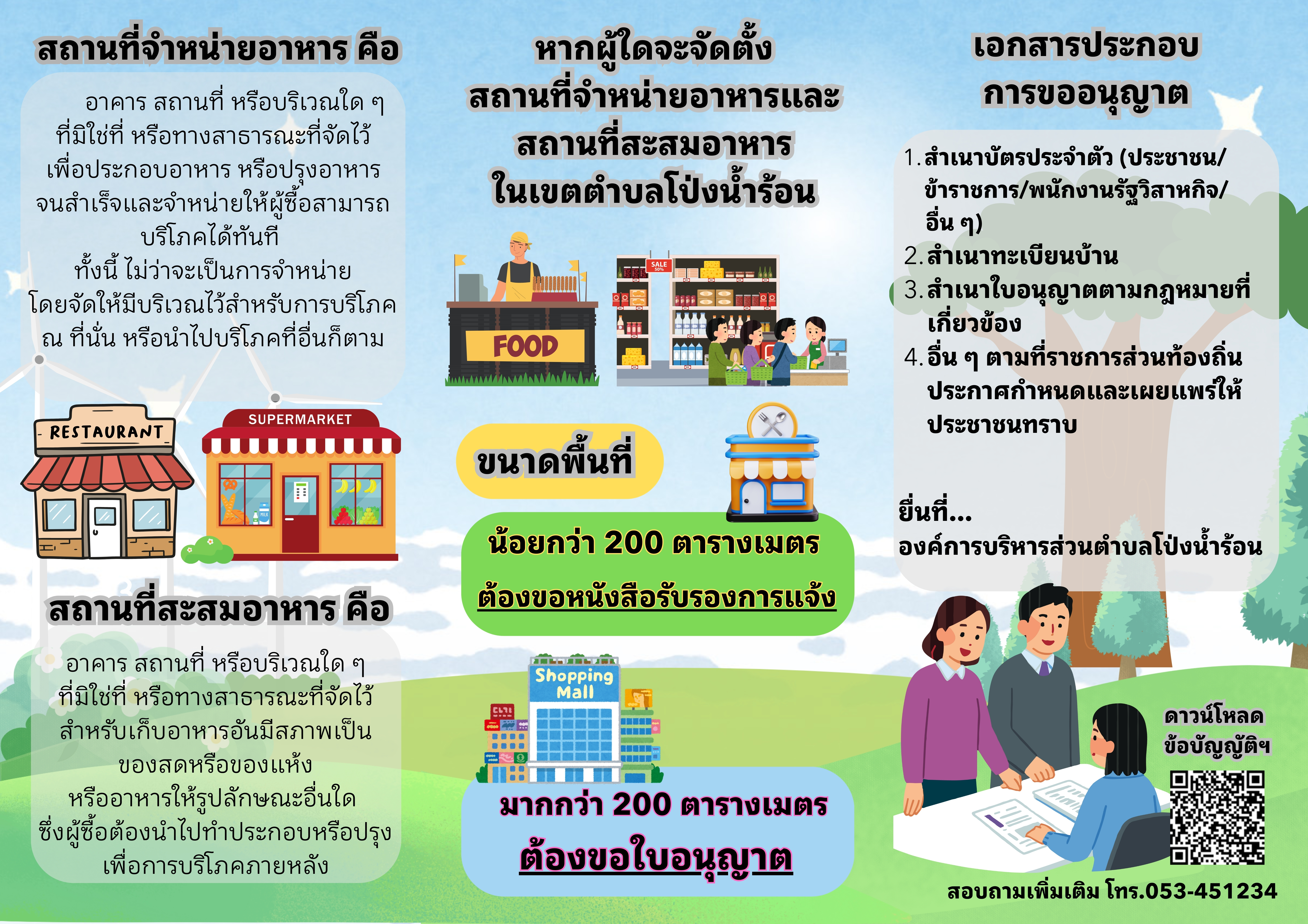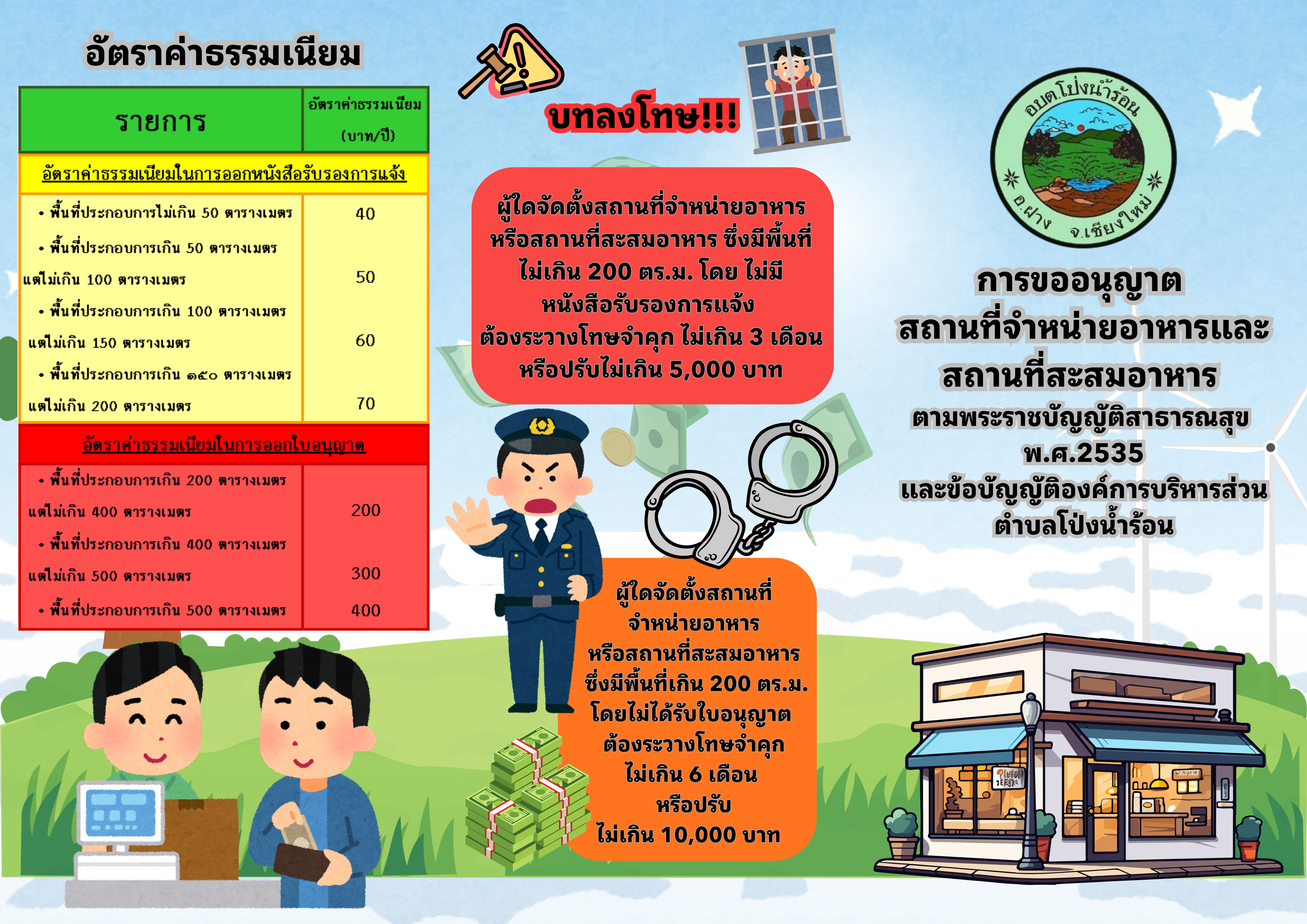 ชื่อเรื่อง : ประชาสัมพันธ์ การขออนุญาตสถานที่จำหน่ายอาหารและ สถานที่สะสมอาหาร ตามพระราชบัญญัติสาธารณสุข พ.ศ.2535 และข้อบัญญัติองค์การบริหารส่วนตำบลโป่งน้ำร้อน