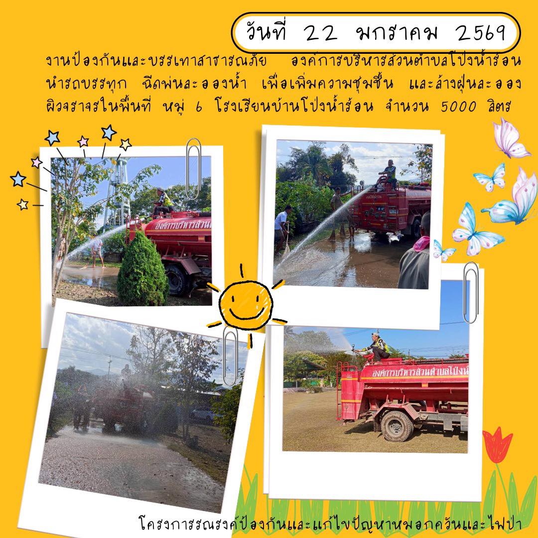 รายละเอียด : วัน พฤหัสบดี ที่ 22 มกราคม 2569 เวลา13.00 น. โครงการรณรงค์ป้องกันและแก้ไขปัญหาหมอกควันและไฟป่า งานป้องกันและบรรเทาสาธารณภัย องค์การบริหารส่วนตำบลโปงน้ำร้อน นำรถบรรทุก ฉีดพ่นละอองน้ำ เพื่อเพิ่มความชุ่มชื้น และล้างฝุ่นละออง ผิวจราจรในพื้นที่ หมู่ 6 โรงเรียนบ้านโป่งน้ำร้อน จำนวน 5000 ลิตร