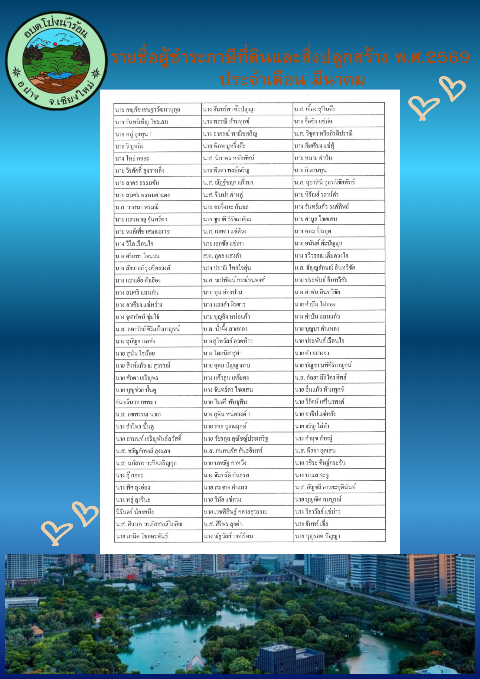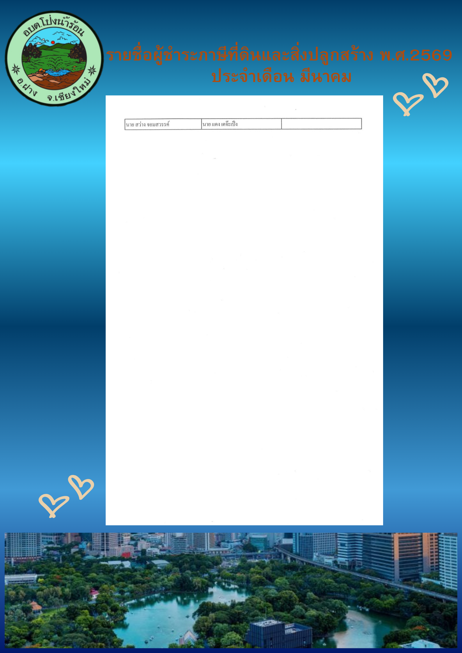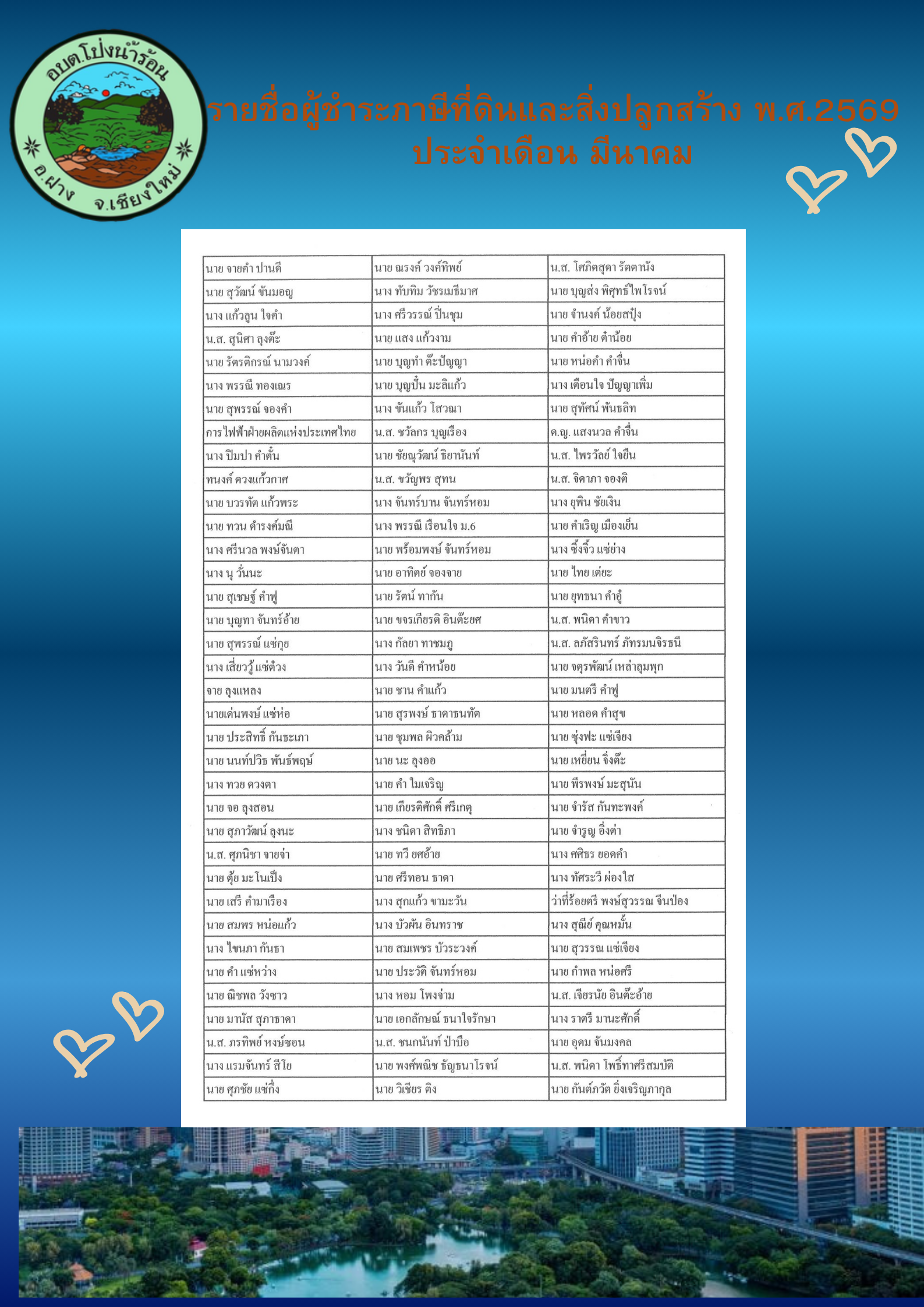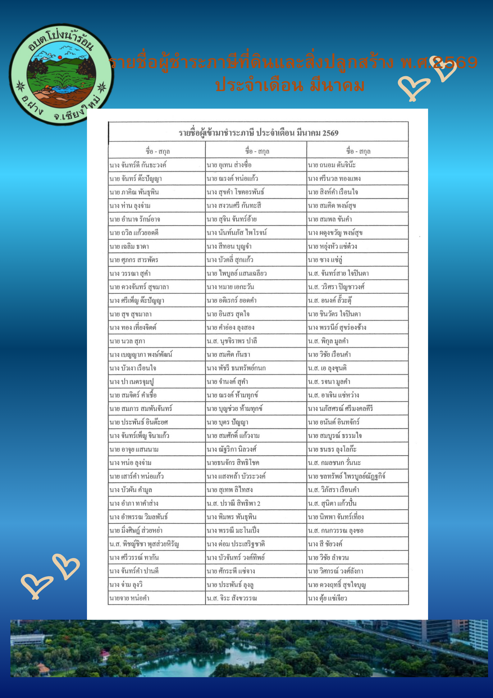 องค์การบริหารส่วนตำบลโป่งน้ำร้อนขอขอบพระคุณประชาชนผู้มีหน้าที่เสียภาษีได้เข้ามารับบริการชำระภาษีที่ดินและสิ่งปลูกสร้าง ทั้งในเวลาทำการและช่วงเวลาพักเที่ยง ณ ที่ทำการ องค์การบริหารส่วนตำบลโป่งน้ำร้อน ตามโครงการบริการด้วยใจ คืนความสุข สร้างรอยยิ้มให้ประชาชน เพื่อประสิทธิภาพ การจัดเก็บภาษี ประจำปี 2569 ประจำเดือน มีนาคม 2569