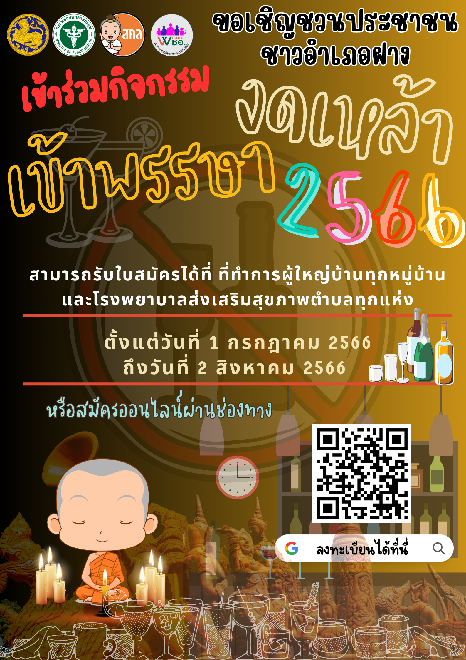 รายละเอียด : เชิญชวนประชาชนในตำบลโป่งน้ำร้อน ร่วมกิจกรรมงดเหล้า เข้าพรรษา ประจำปี 2566 โดยติดต่อลงทะเบียนรายชื่อได้ที่ผู้ใหญ่บ้านทุกหมู่บ้าน รพ.สต.บ้านท่าหัด หรือทาง QR Code ในรูปประชาสัมพันธ์