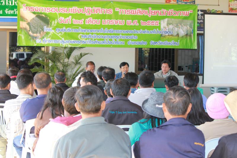 รายละเอียด : องค์การบริหารส่วนตำบลโป่งน้ำร้อนร่วมกับศูนย์บริการและถ่ายทอดเทคโนโลยีการเกษตรประจำตำบลโป่งน้ำร้อน สำนักงานเกษตรอำเภอฝาง ได้จัดโครงการฝึกอบรมเชิงปฏิบัติการทำปุ๋ยหมักชีวภาพ เพื่อเป็นการลดต้นทุนการผลิต และให้ความรู้แก่เกษตรกรในการทำปุ๋ยหมักแบบใหม่ วันที่ 24 มกราคม 2555 เวลา 08.30 น. ณ สำนักงานกลุ่มเกษตรทำไร่ตำบลโป่งน้ำร้อน หมู่ที่ 7 บ้านต้นผึ้งใต้ อำเภอฝาง จังหวัดเชียงใหม่