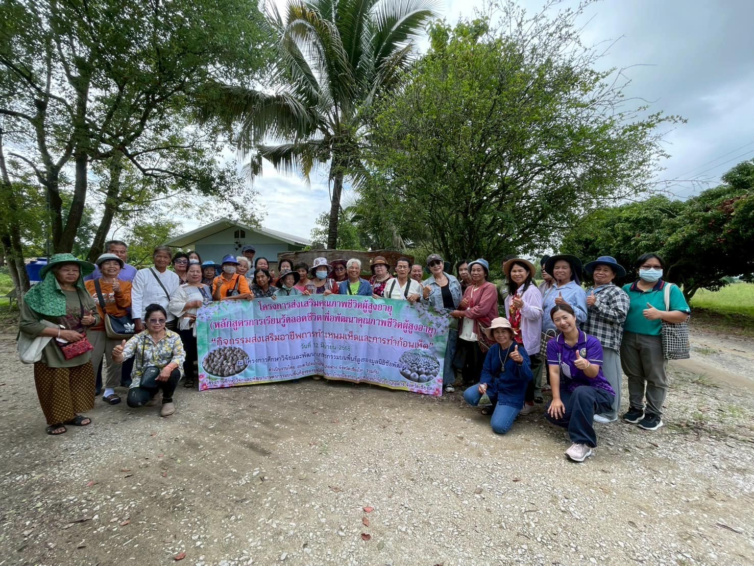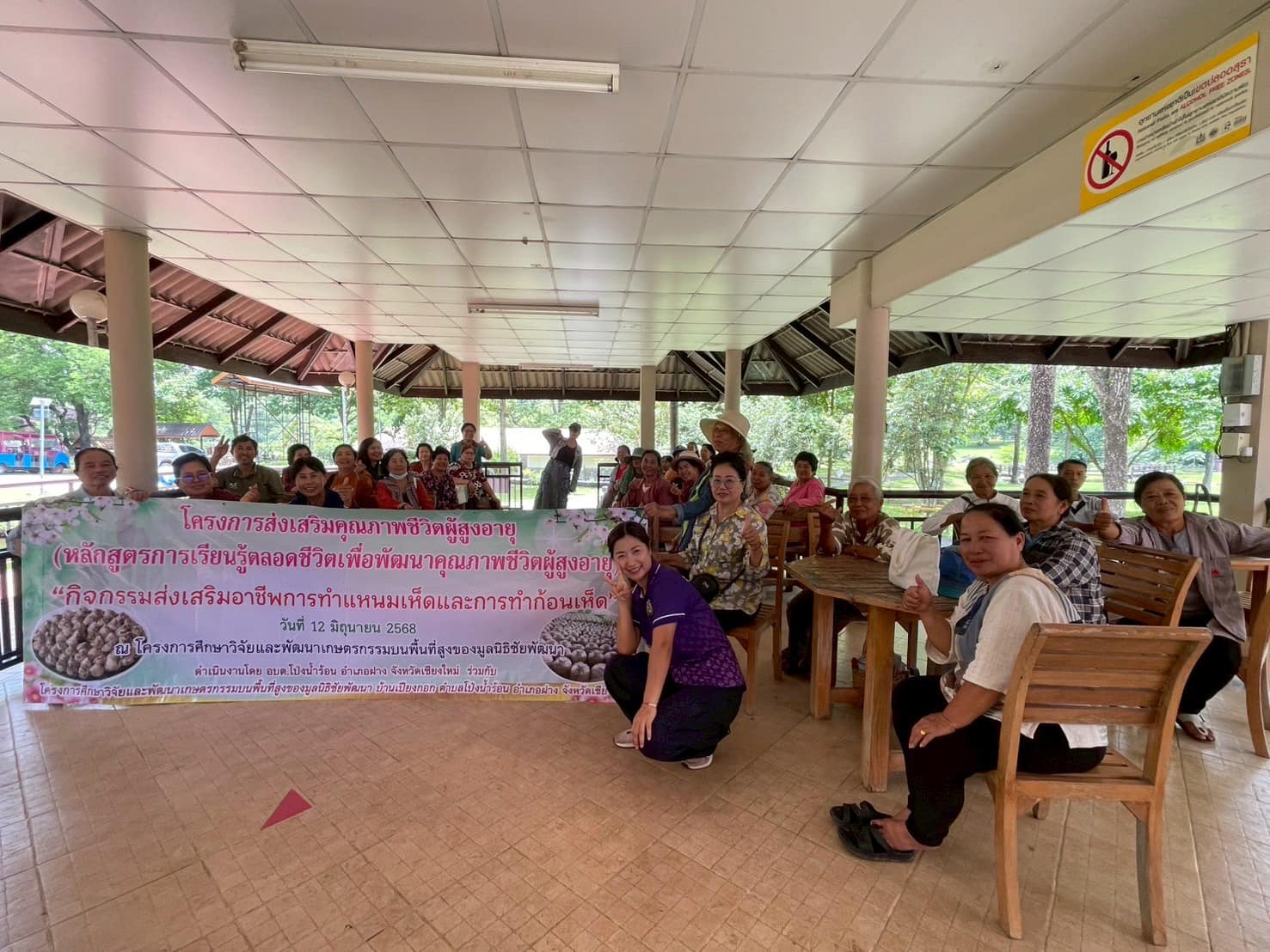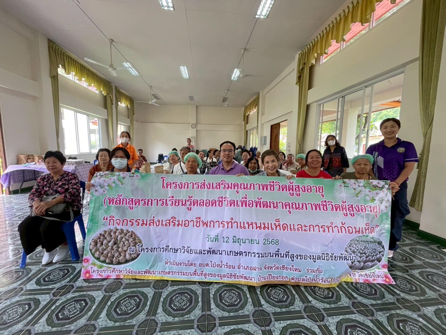 โครงการส่งเสริมคุณภาพชีวิตผู้สูงอายุ (หลักสูตรการเรียนรู้ตลอดชีวิตเพื่อพัฒนาคุณภาพชีวิตผู้สูงอายุ "กิจกรรมส่งเสริมอาชีพการทำแหนมเห็ดและการทำก้อนเห็ด" ณ โครงการศึกษาวิจัยและพัฒนาเกษตรกรรมบนพื้นที่สูงของมูลนิธิชัยพัฒนา ดำเนินงานโดย อบต.โป่งน้ำร้อน อำเภอฝาง จังหวัดเชียงใหม่ ร่วมกับโครงการศึกษาวิจัยและพัฒนาเกษตรกรรมบนพื้นที่สูงของมูลนิธิชัยพัฒนา บ้านเปียงกอก ตำบลโป่งน้ำร้อน อำเภอฝาง จังหวัดเชียงใหม่