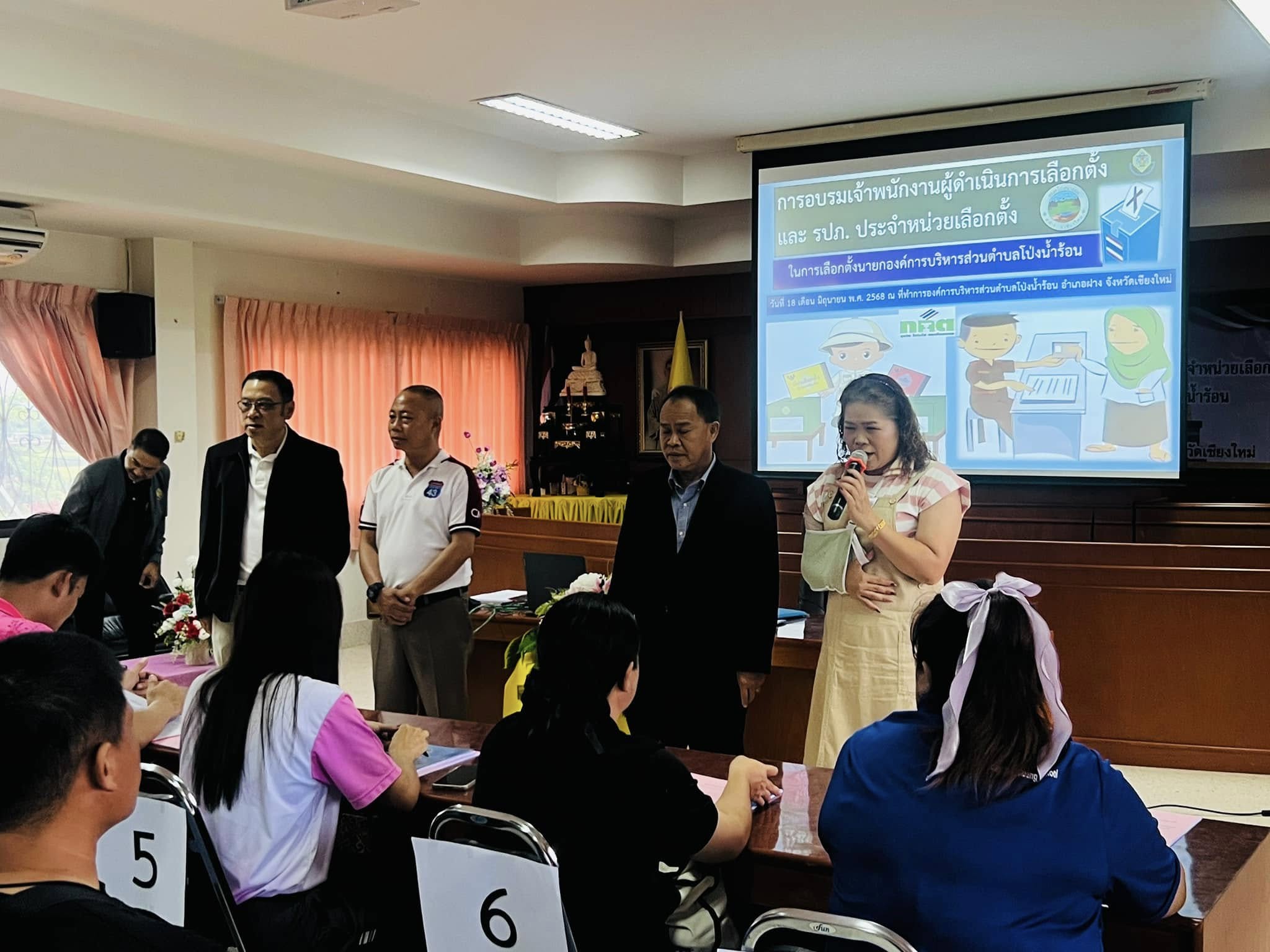 นางศรีวรรณ์ ชาญกิจ ประธานคณะกรรมการการเลือกตั้งประจำองค์การบริหารส่วนตำบลโป่งน้ำร้อน กล่าวเปิดอบรมโครงการอบรมเจ้าพนักงานผู้ดำเนินการเลือกตั้ง และ รปภ. ประจำหน่วยเลือกตั้ง เพื่อรองรับการจัดการเลือกตั้งนายกองค์การบริหารส่วนตำบลโป่งน้ำร้อน ณ ห้องประชุมสภาองค์การบริหารส่วนตําบลโป่งน้ำร้อน