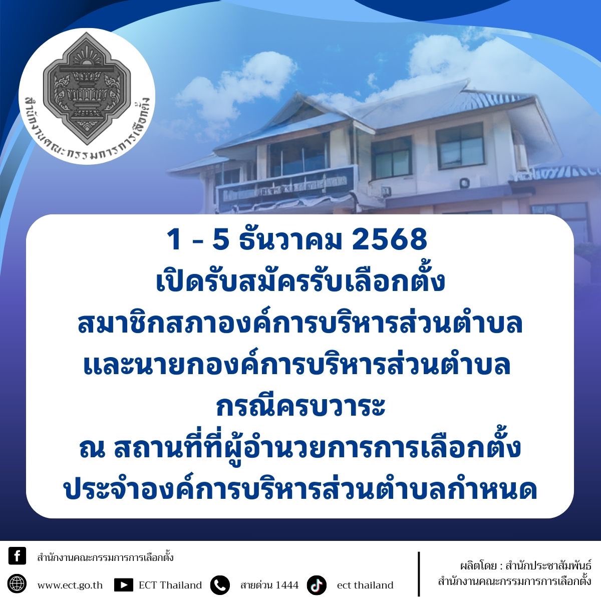 1 – 5 ธันวาคม 2568 เปิดรับสมัครรับเลือกตั้งสมาชิกสภาองค์การบริหารส่วนตำบลและนายกองค์การบริหารส่วนตำบล กรณีครบวาระ