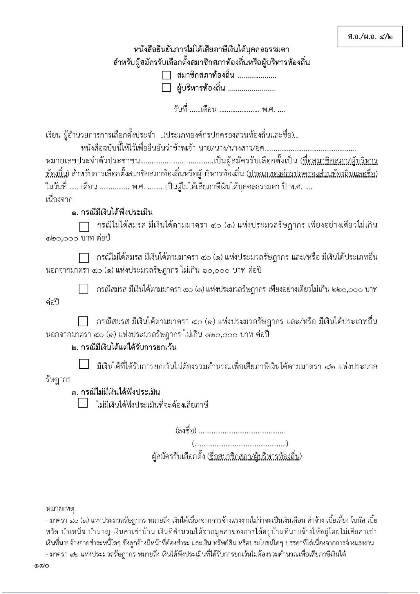 3.7 หลักฐานการเสียภาษีเงินได้บุคคลธรรมดาเป็นเวลาติดต่อกัน 3 ปี (2565, 2566, 2567) นับถึงปีที่สมัครรับเลือกตั้ง เว้นแต่เป็นผู้ไม่ได้เสียภาษีเงินได้ ให้ทำหนังสือยืนยันการไม่ได้เสียภาษี พร้อมทั้งสาเหตุแห่งการไม่ได้เสียภาษีตามแบบ ส.ถ./ผ.ถ. 4/2