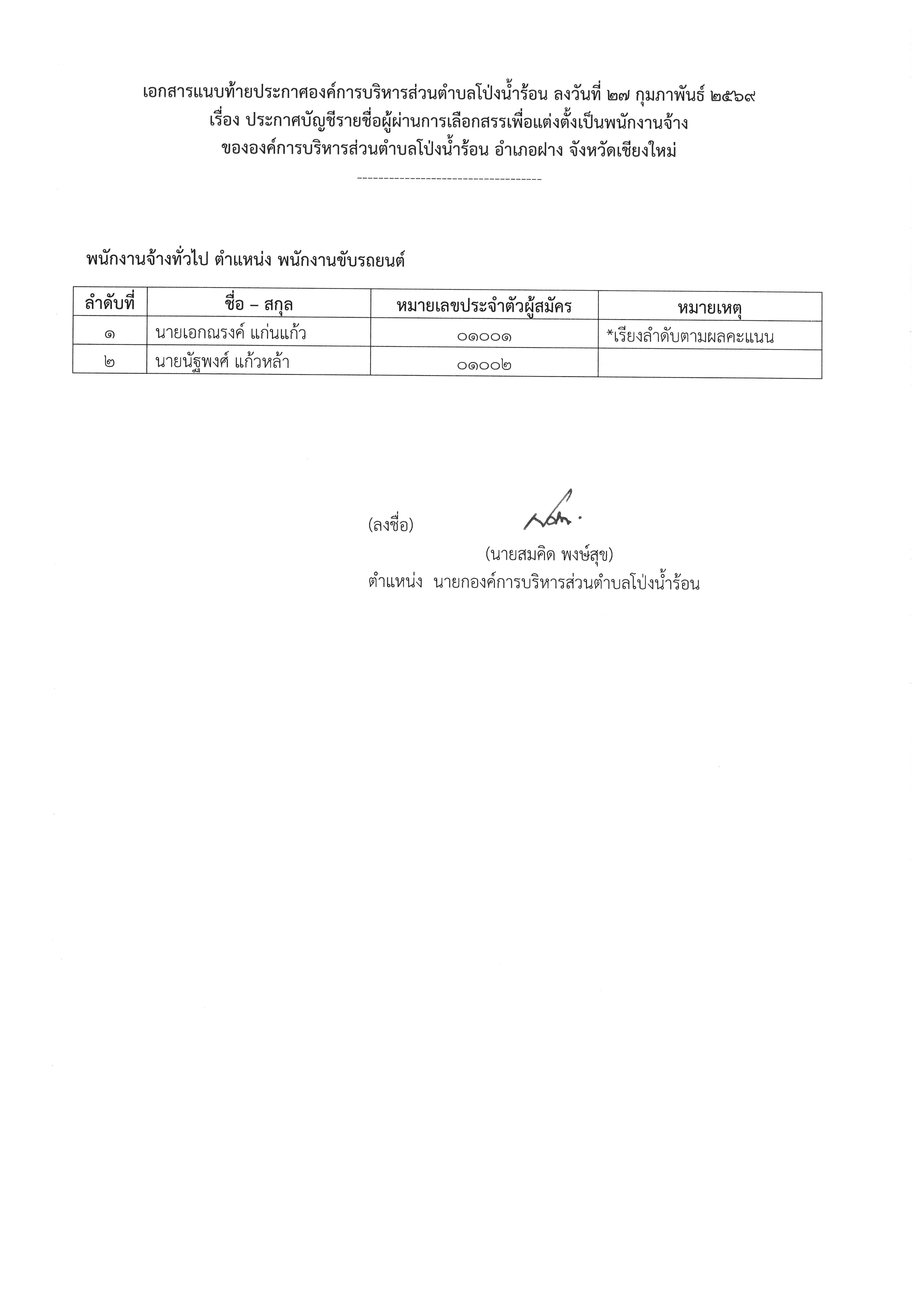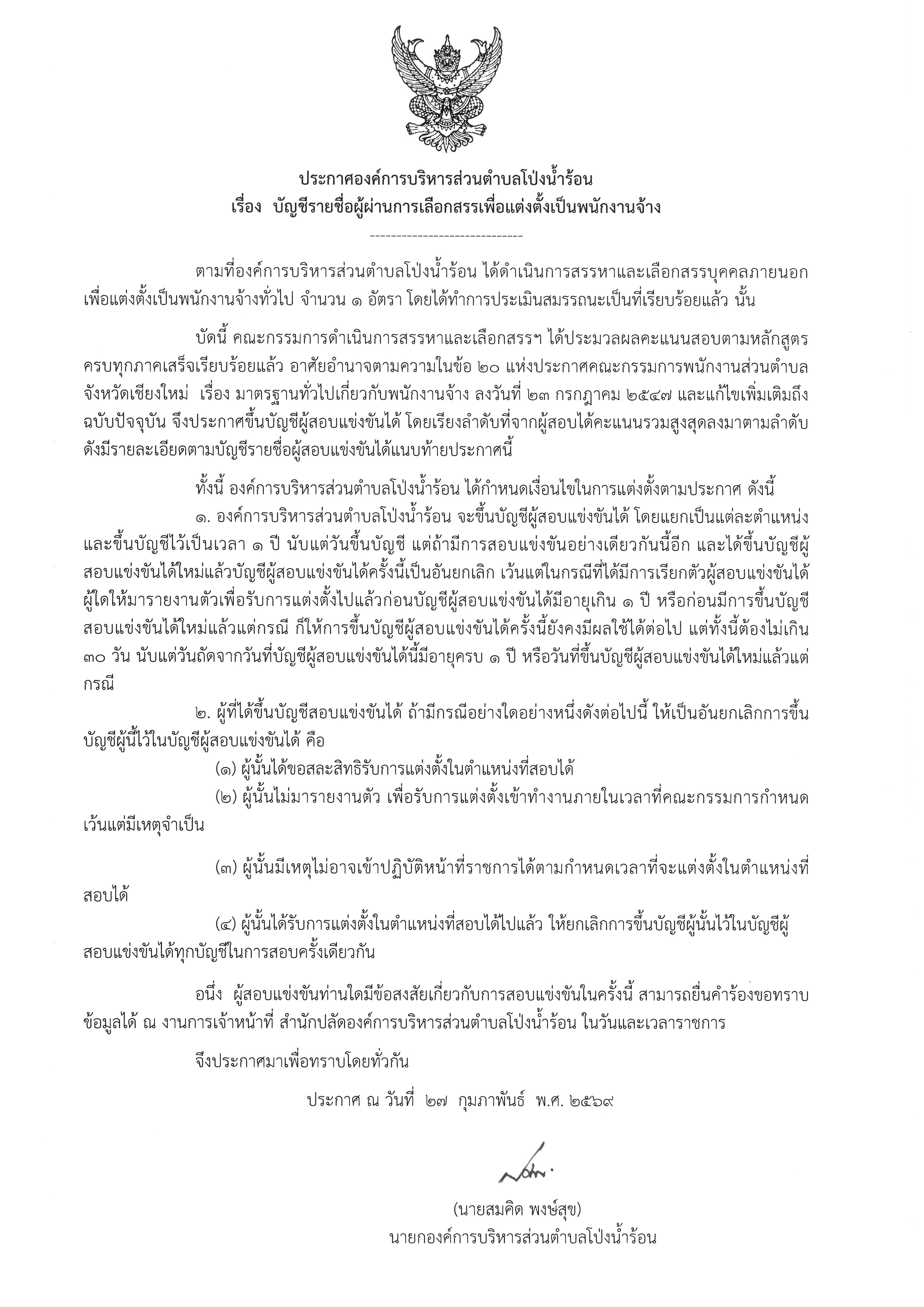 ประกาศ บัญชีรายชื่อผู้ผ่านการเลือกสรรเพื่อแต่งตั้งเป็นพนักงานจ้าง