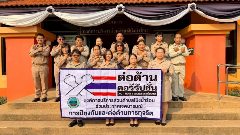 เมื่อวันพุธ ที่ 18 เดือนมีนาคม พ.ศ. 2569 เวลา 09.30 น. องค์การบริหารส่วนตำบลโป่งน้ำร้อน นำโดย นายสมคิด พงษ์สุข นายกองค์การบริหารส่วนตำบลโป่งน้ำร้อน ร่วมด้วยคณะผู้บริหาร สมาชิกสภา อบต. พนักงานส่วนตำบล ลูกจ้างประจำและพนักงานจ้าง ได้จัดกิจกรรมประกาศเจตนารมณ์ต่อต้านการทุจริต พร้อมมอบนโยบายและให้ความรู้และแนวทางปฏิบัติด้านจริยธรรมของเจ้าหน้าที่ของรัฐ ตามประมวลจริยธรรมของข้าราชการส่วนท้องถิ่นและแนวทางปฏิบัติประพฤติตนทางจริยธรรมของพนักงาน